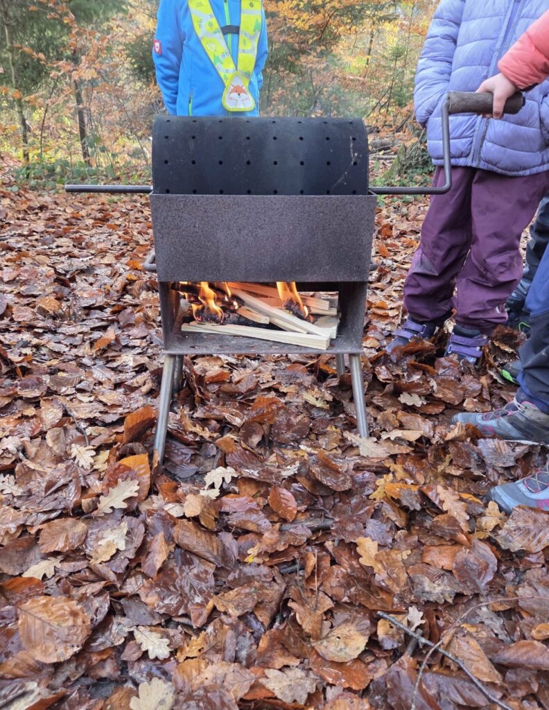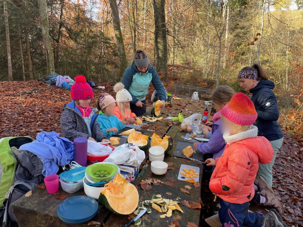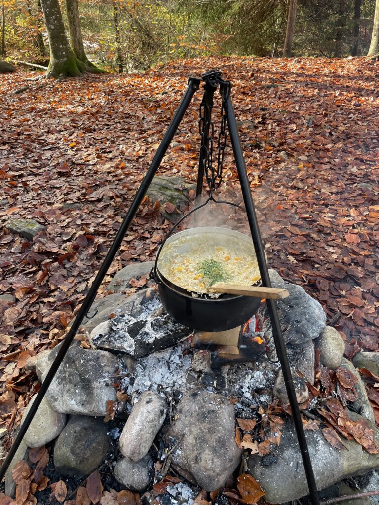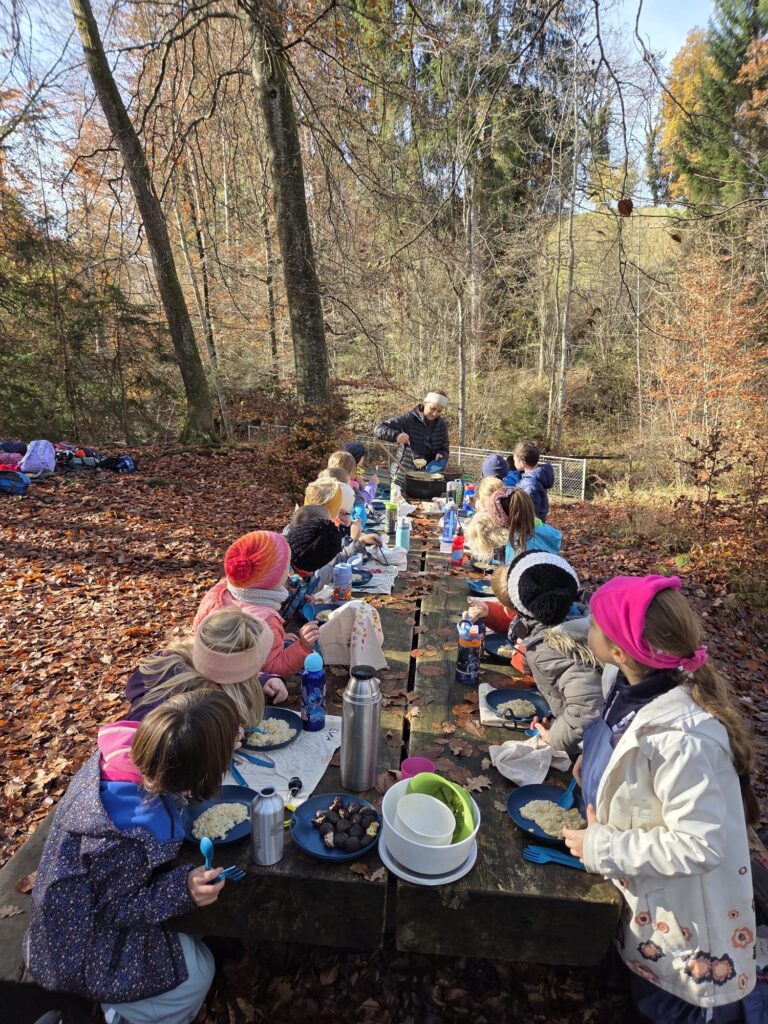 Au son du crépitement du feu, ils ont tourné le brisoloir, puis dégusté de délicieuses châtaignes accompagnées d’un thé chaud. Ils ont ensuite participé à la préparation du dîner : un savoureux risotto à la courge. Pendant que celui-ci mijotait sur le feu, les enfants ont découvert de nombreuses informations sur la mésange charbonnière.
